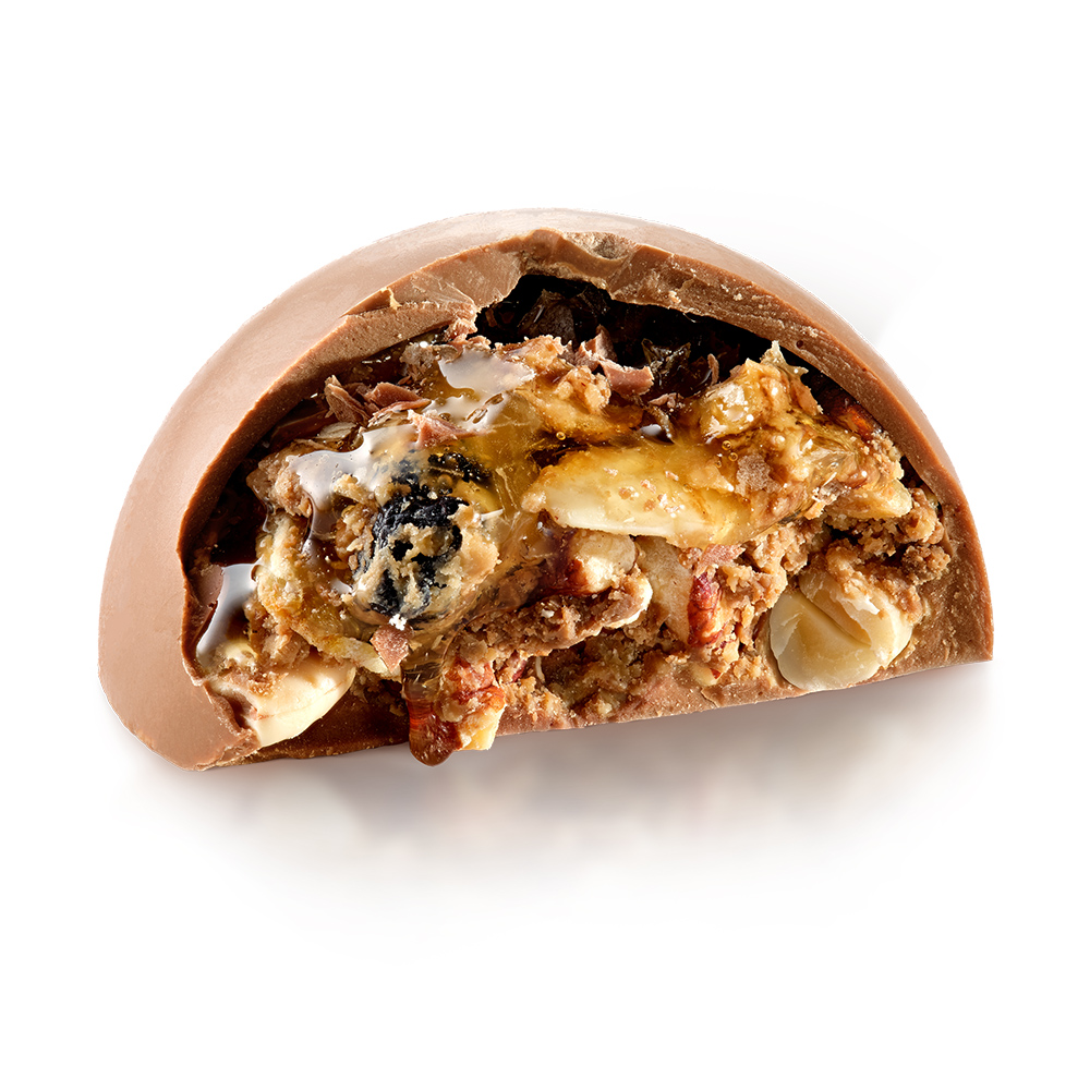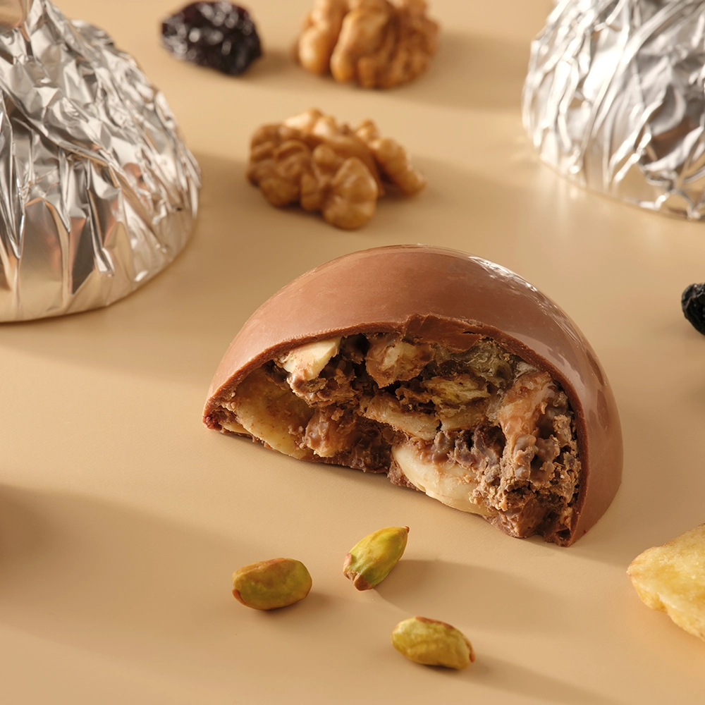молочный/Gold шоколад, медовые соты, фисташки, миндаль, грецкие орехи, курага, голубика, сушеный банан
